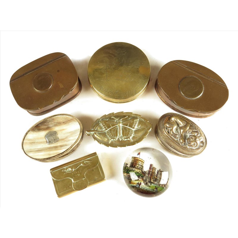 A 19th century horn snuff box with an applied shield engraved with a ship and titled 'KIRKWALL', 2½in (6.4cm) wide, two brass snuff boxes one engraved with a man on a bicycle, inscribed 'Modern Prophecy', the other in the form of satchel inscribed 'TALLY HO', a brass box in the form of an oval urn the lid with a butterfly on a leaf by 'HUTTON & CO. LONDON' with a registration lozenge, two copper snuff boxes with applied coins, an oval box with a lion finial and a Windsor souvenir paperweight. (8)