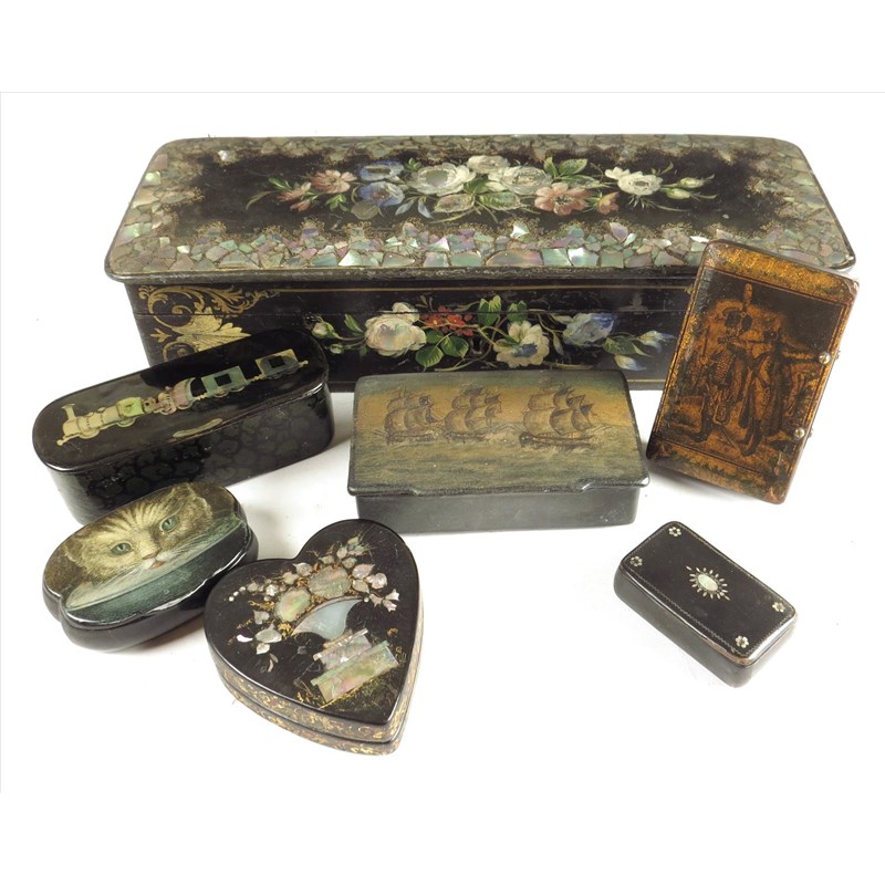 MAURICE', 12¼in (31cm) wide, together with six papier-mâché snuff boxes, one painted with a cat's head, one with three tall ships, one with grenadiers, the others inlaid with mother of pearl. (7)