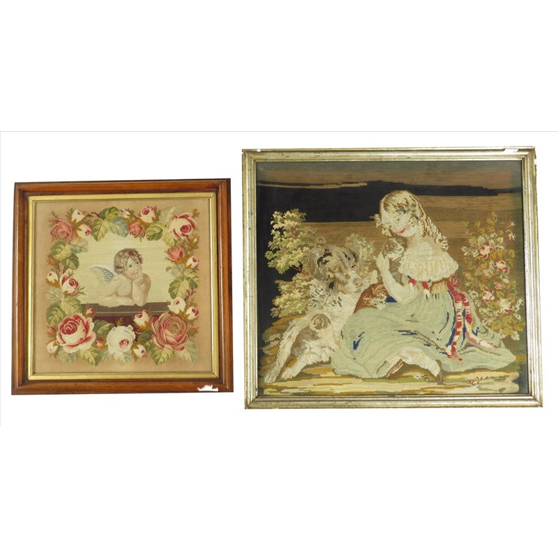‡Two Victorian Berlin woolwork pictures, of a young girl with her dog and two puppies, 21½ x 24½in (54.5 x 62cm) in a glazed gilt frame and a one of putto within a floral border, in a glazed rosewood frame. (2)