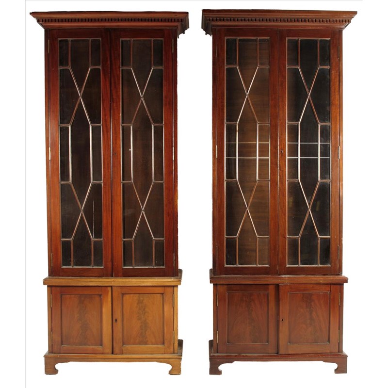 A pair of mahogany cabinets, each with fixed shelves enclosed by a long astragal glazed door above a pair of panelled doors, 86¼in (219cm) high, 36¾in (93.4cm) wide, 13¼in (33.5cm) deep. (2)