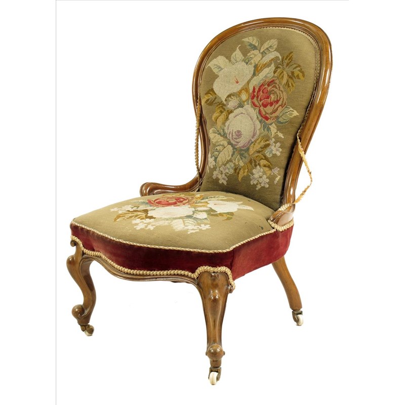 A Victorian walnut nursing chair, with a tapestry upholstered back and seat on ceramic castors.