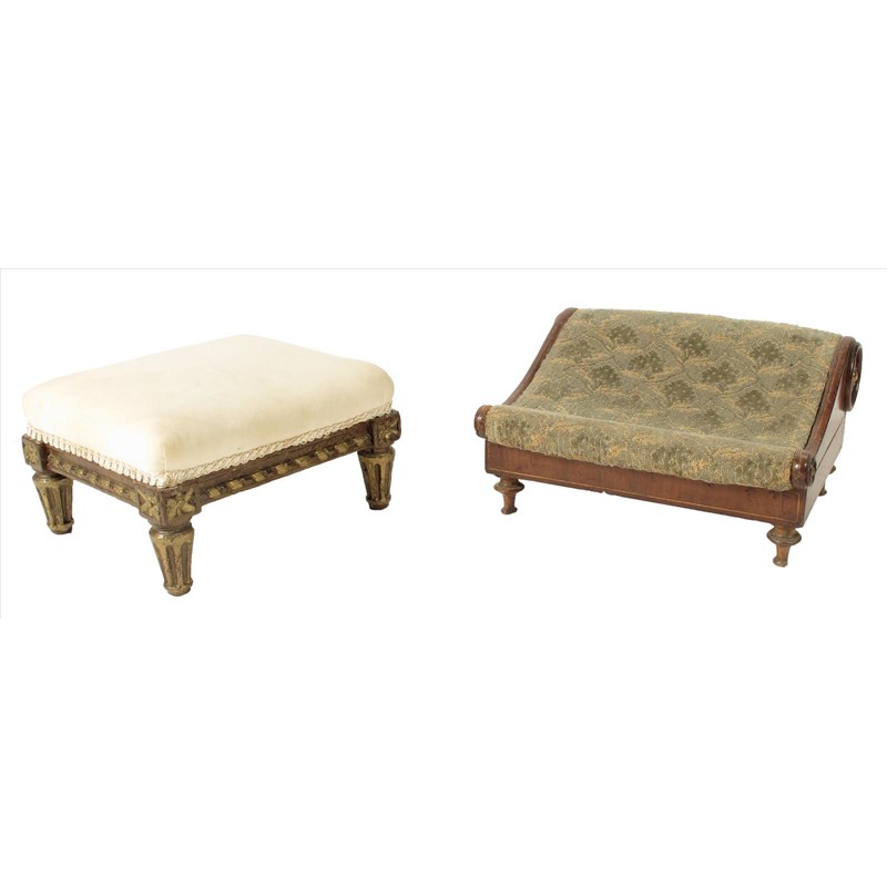 A 19th century French mahogany gout stool, with stringing and gilt brass star mounts, 7in (18cm) high, 13½in (34.2cm) wide, 11¾in (30cm) deep, and a parcel giltwood rectangular foot stool. (2)