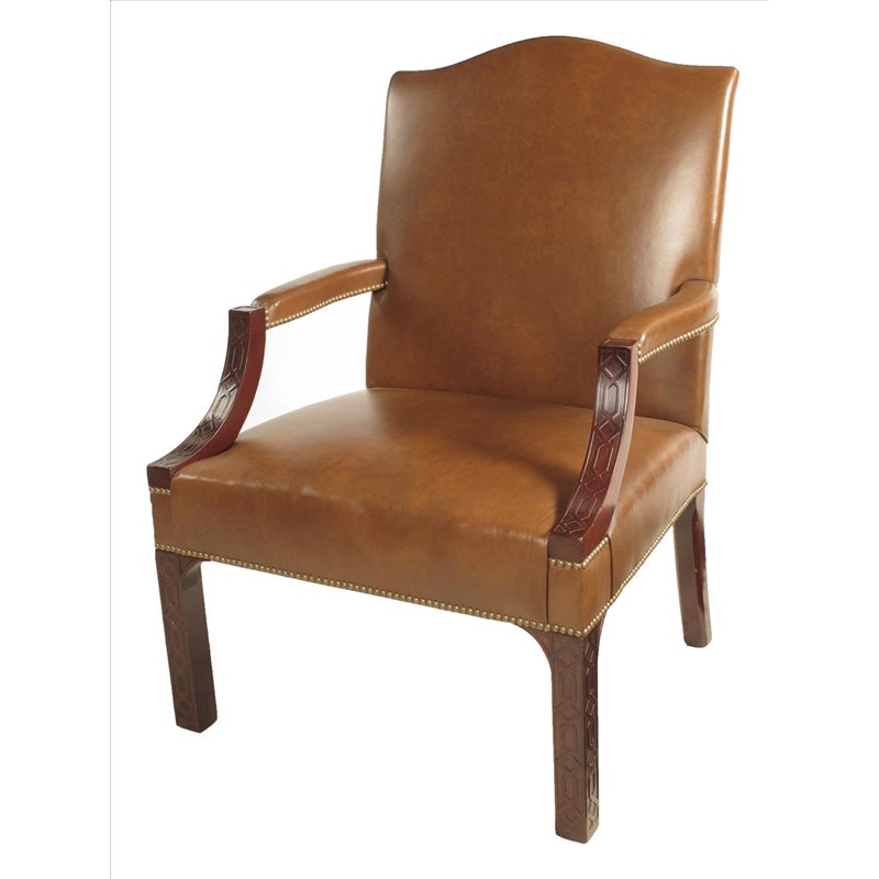 A late Victorian mahogany Gainsborough armchair, later upholstered studded brown leather on blind fret front legs.