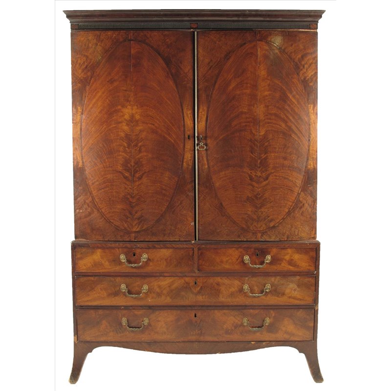 A George III mahogany linen press, with a detachable fluted and marquetry paterae cornice above a pair of doors with oval veneers with crossbanding and stringing, the interior with one slide, above two short and two long drawers with cast gilt brass handles, on splay bracket feet, 79½in (202cm) high, 56in (142.3cm) wide, 25½in (65cm) deep.