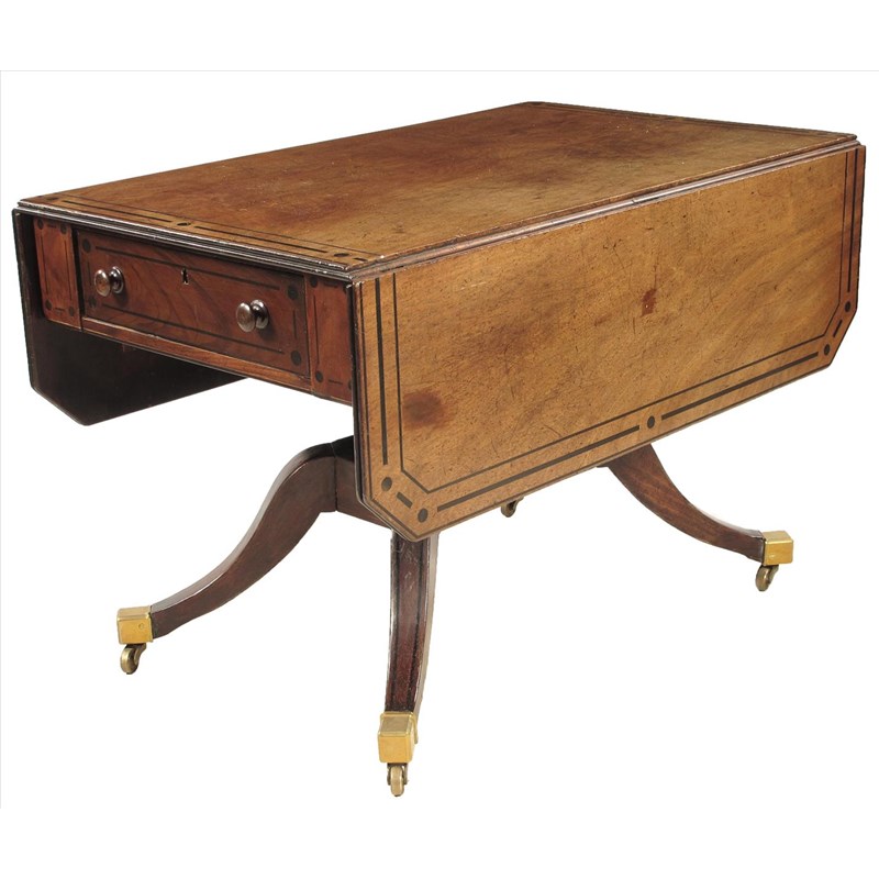A George IV mahogany supper table, with ebonised line inlay and dot and dash banding, end frieze drawers, one part divided, with later wood handles, 28in (71cm) high, 27½in (69cm) wide closed, 41½in (105.5cm) deep.