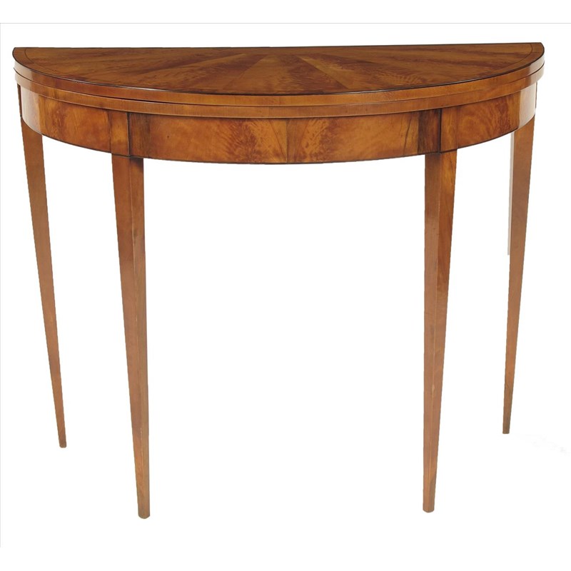 A late 19th century satinwood card table, with segmented and crossbanded top with fine stringing, baize lined, on twin gates, 28¾in (73cm) high, 36¼in (92cm) wide, 17¾in (45cm) deep.