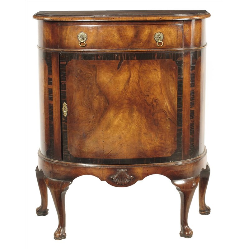 A late 19th century walnut and coromandel banded bowfront side cabinet, with a frieze drawer above a cupboard, 36in (91.8cm) high, 31½in (80cm) wide, 15in (37.8cm) deep.