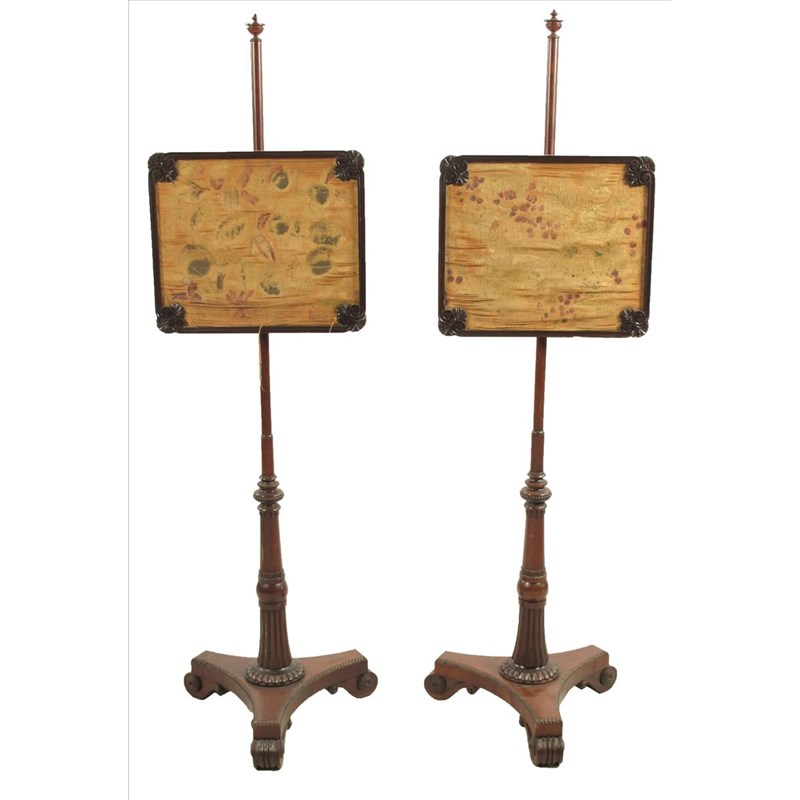 ‡A pair of William IV rosewood pole firescreens, with anthemion and scroll rectangular frames, on ribbed, beaded and petal carved stems with triform bases, 53in (134.5cm) high, 15½in (59.4cm) wide. (2)