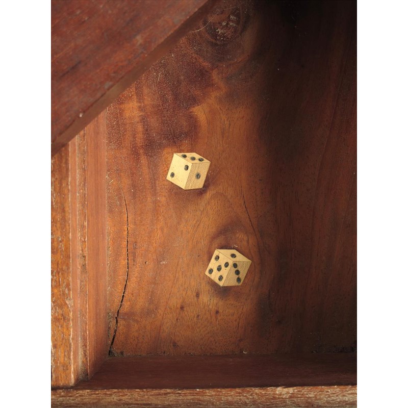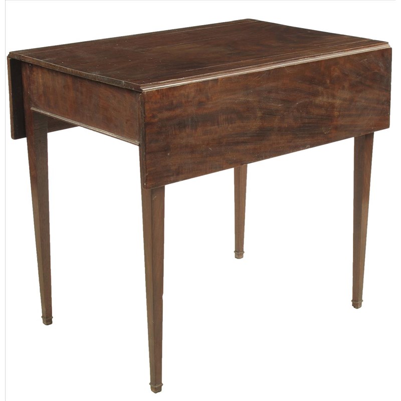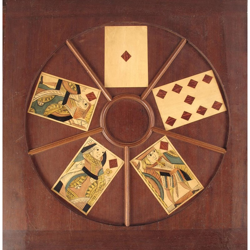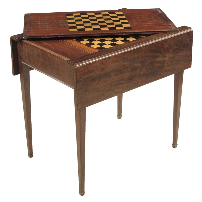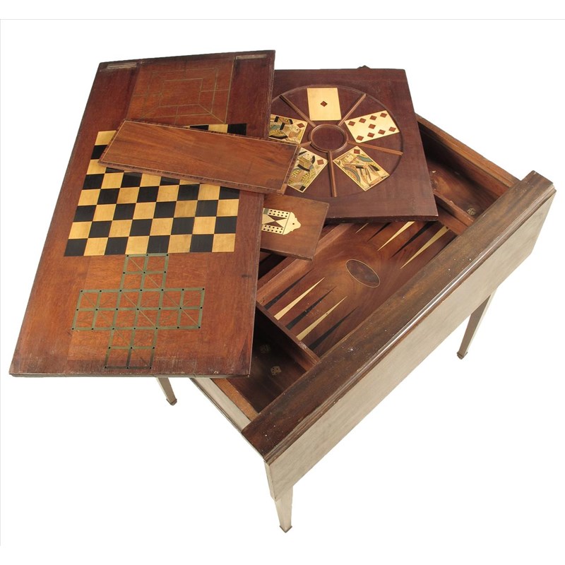 A George III mahogany Pembroke games table, the drop-leaf top with a sliding central section, the underside inlaid in ebony and sycamore a chequer board and outlined in green stained sycamore, two other game boards, revealing a compartmented interior with a central backgammon board, flanked by two counter compartments inlaid with trompe l'oeil dice, the lids kingwood banded, one inlaid a chequer board, the underside of one inlaid a cribbage board and the backgammon lid inlaid marquetry, parquetry and penwork playing cards, on square tapering legs, with moulded ankles, together with assorted counters, chess pieces, backgammon pieces and playing cards, 27½in (69.8cm) high, 30in (75.8cm) wide, 20¾in (52.7cm) closed.
