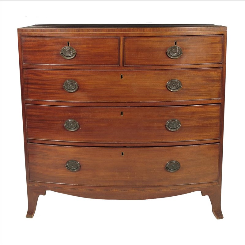 A mahogany bowfront chest, the top with later stringing, early 19th century and later, 40¾in (103.5cm) high, 43in (109.2cm) wide, 21in (53.3cm) deep.