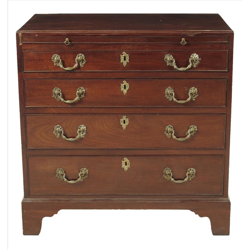 A George III mahogany bachelor's chest, with a caddy moulded edge top with a brushing slide and four long graduated drawers and bracket feet, 32½in (82.3cm) high, 32¾in (82.8cm) wide, 18¼in (46.3cm) deep.