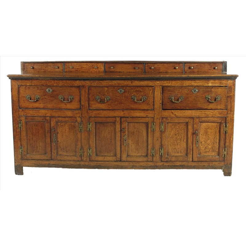 A George III oak dresser, with spice drawers above frieze drawers and three pairs of panel cupboard doors, 39¾in (101cm) high, 79in (200.6cm) wide, 19¾in (50.2cm) deep.