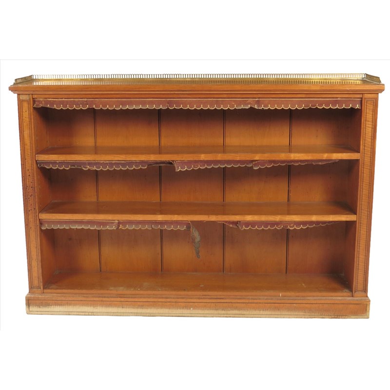 A late Victorian satinwood open bookcase, with ebonised stringing with a gilt brass three quarter gallery, with two adjustable shelves, 36¾in (93.5cm) high, 53½in (136cm) wide, 9½in (24cm) deep.