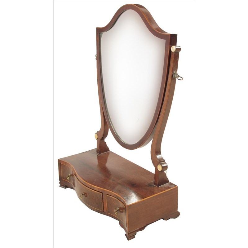 A mahogany shield shape toilet mirror, with boxwood edging and applied bone rondels, the serpentine front drawers with burr oak veneers, 24¼in (61.5cm) high, 16½in (42cm) wide, 8in (20.2cm) deep.