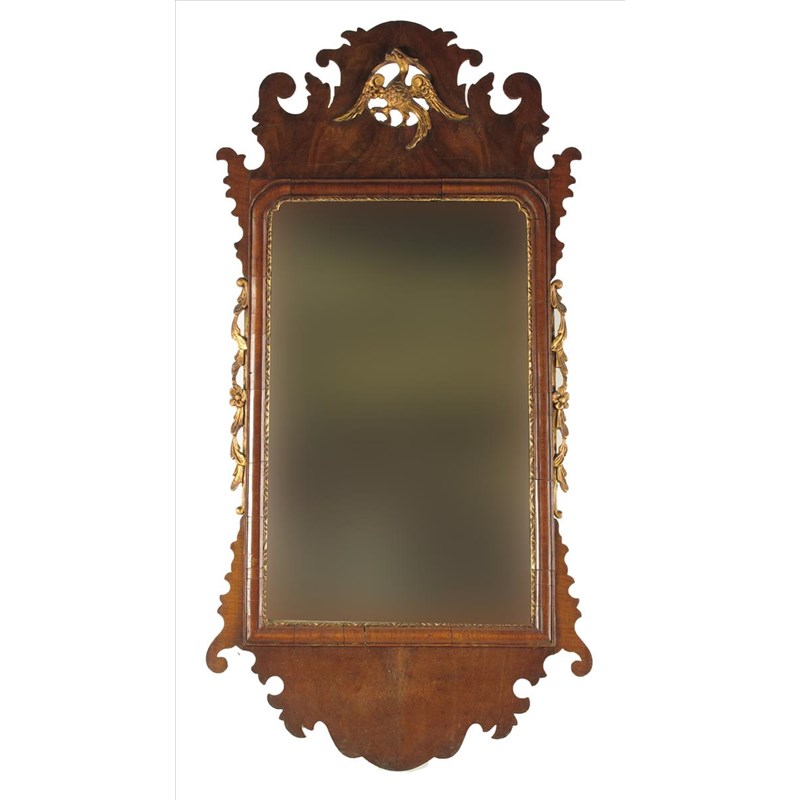 A walnut fret frame mirror, parcel gilt decorated, late 19th century, 38¼ x 19¼in (97 x 49cm).