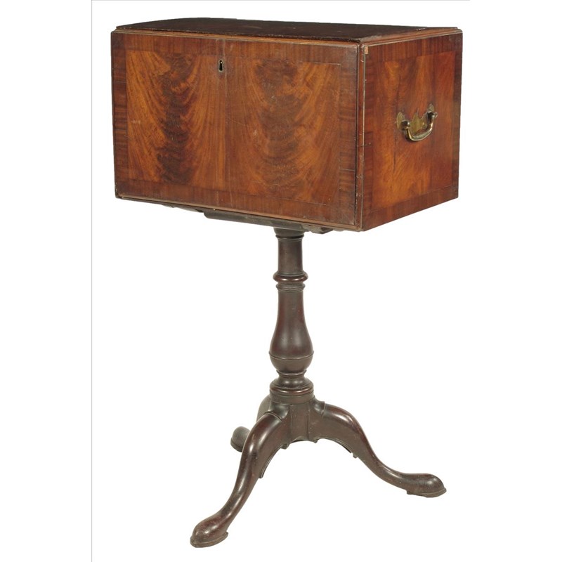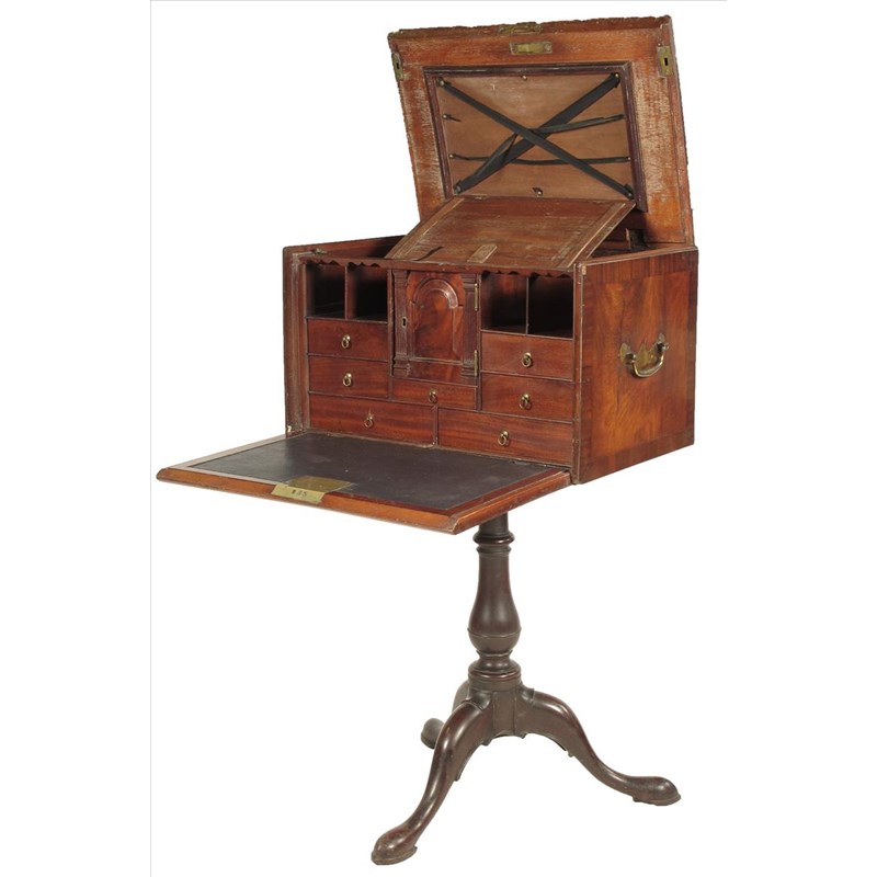 A George III mahogany travelling writing desk on a tripod stand, crossbanded overall, the hinged top fitted a stationery compartment to a hinged lined fall revealing an arrangement of drawers and pigeon holes around a panelled cupboard door with pilasters revealing four graduated drawers, on a baluster turned stem on cabriole legs and pointed pad feet, with brass side carrying handles, 41½in (105.4cm) high, 25in (63.3cm) wide, 22in (56cm) deep.