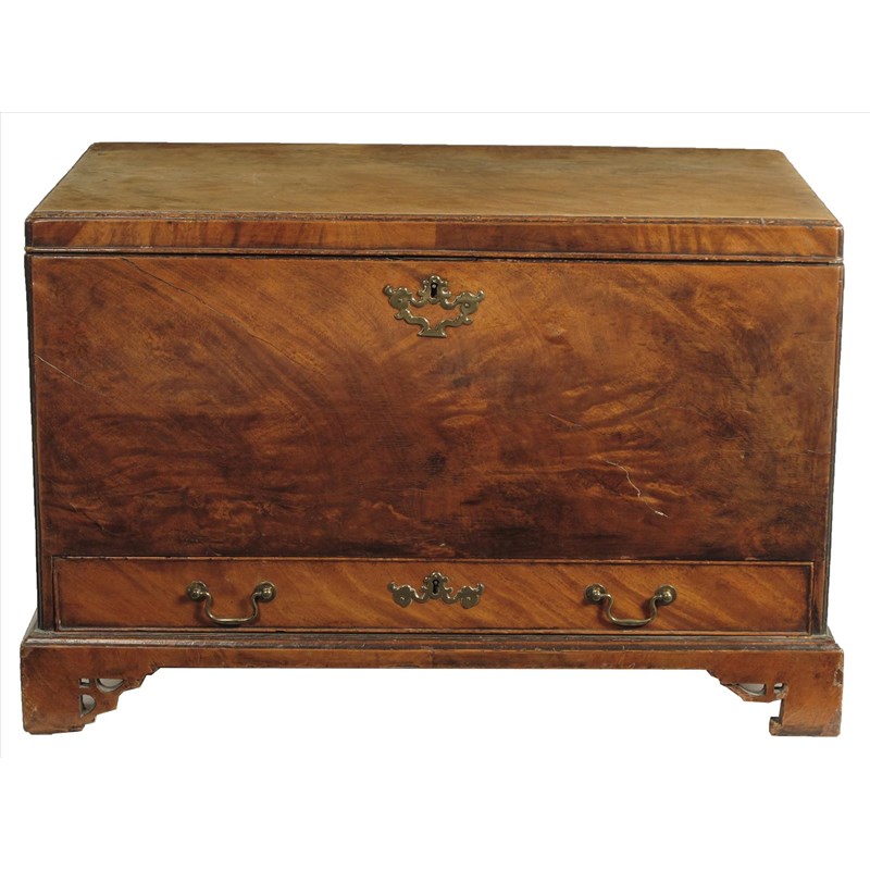 A mahogany blanket chest, the base with a drawer on fret bracket feet, 23in (58.3cm) high, 35¾in (90.3cm) wide, 20in (50.5cm) deep.