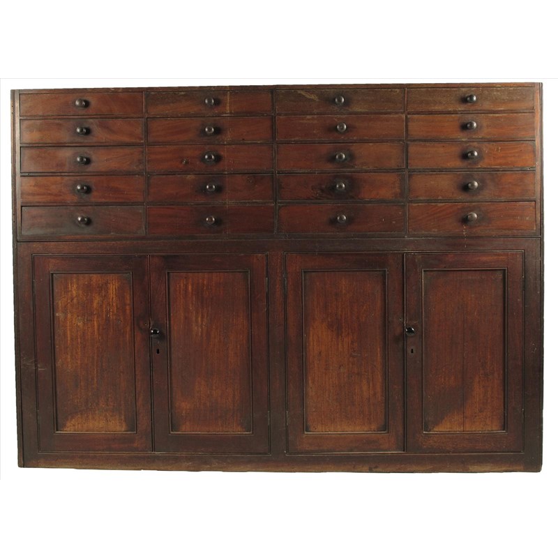 An early Victorian mahogany housekeeper's cupboard, with a bank of twenty drawers above twin cupboards enclosing a shelf, 55¼in (140.2cm) high, 75¾in (192.6cm) wide, 11in (28cm) deep.
