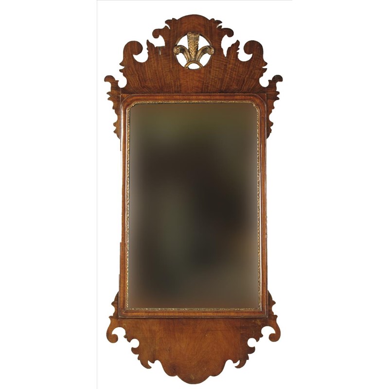 A walnut fret frame mirror, with parcel gilt decoration, early 20th century, 38½ x 19in (97.8 x 48.2cm).