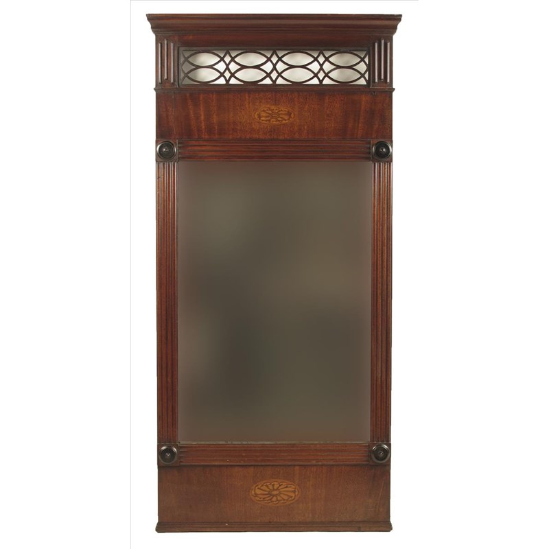 A 19th century continental mahogany wall mirror, with a pierced frieze and two marquetry paterae panels and a bevelled plate, 51¼ x 25in (130 x 63.5cm).