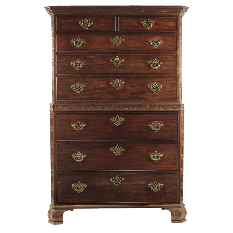 A George III mahogany secretaire chest on chest, with blind fret carving and canted corners, with a dentil cornice above two short and three long drawers, to a girdle frieze and a drawer, fitted a central cupboard door flanked by a pair of reeded column compartments, drawers and pierced bracket pigeon holes, above two further long drawers, with pierced brass plate handles and escutcheons, on ogee bracket feet, 73in (185.5cm) high, 48in (122cm) wide, 22½in (57cm) deep.