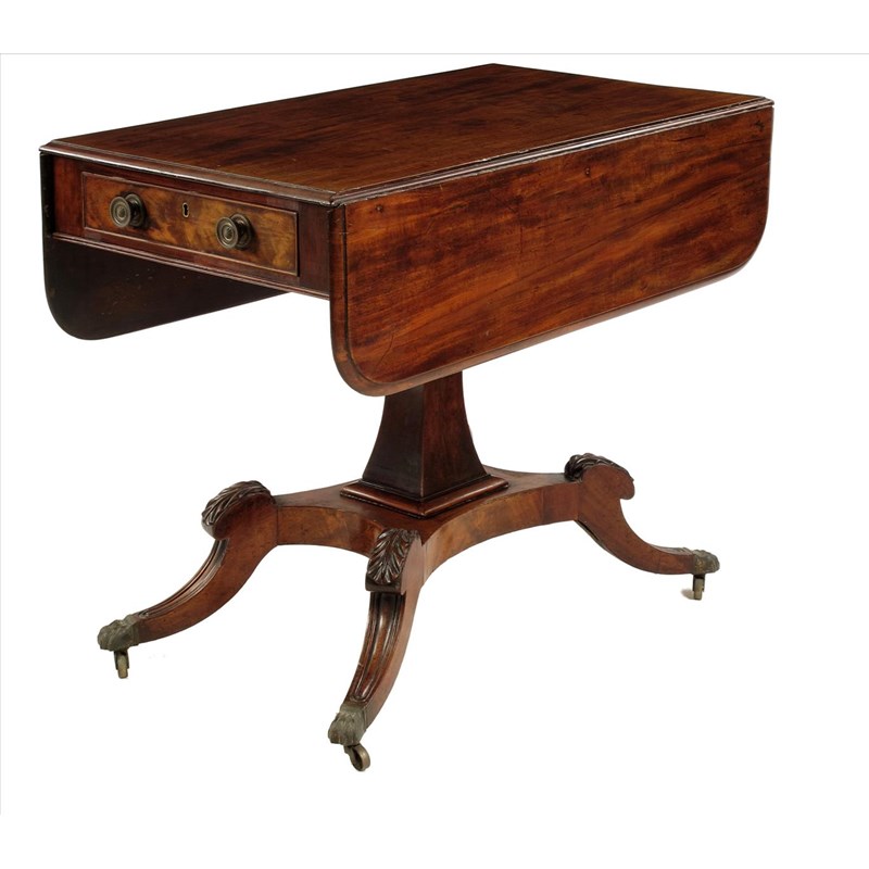 A William IV mahogany Pembroke table, with a frieze drawer, 28½in (72.5cm) high, 20¾in (52.7cm) wide, closed, 35¾in (91cm) deep.