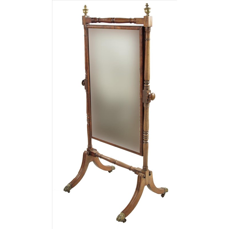 An early Victorian mahogany cheval mirror, with replaced gilt brass urn finials, 51½in (130.6cm) high, 25in (63.5cm) wide, 20in (50.8cm) deep.