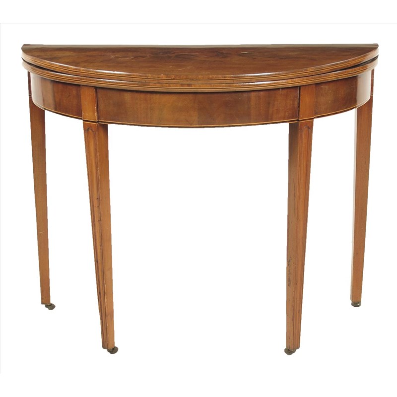 A mahogany demi-lune tea table, with stringing, 19th century and later, 28½ (72.5cm) high, 36in (91.4cm) wide, 17¾in (45cm) deep.