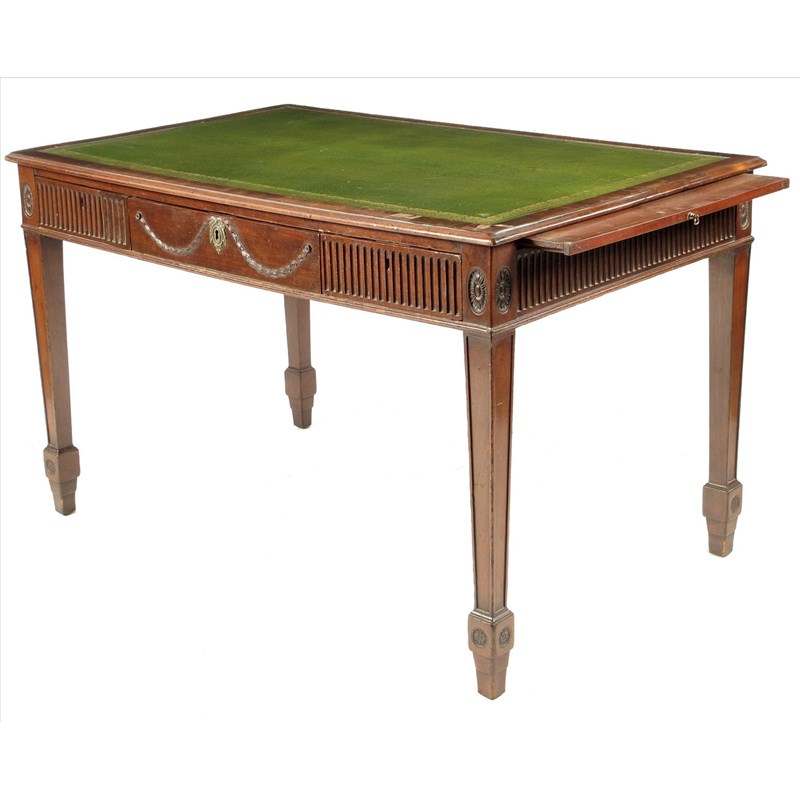 A 19th century mahogany writing desk in Adam style, the moulded edge top inset replaced green leather, above three frieze drawers with fluted and applied husk swag decoration, the sides with pull-out slides on panel tapering legs headed by paterae, 30in (70.8cm) high, 48in (121.8cm) wide, 29¾in (75.4cm) deep.
