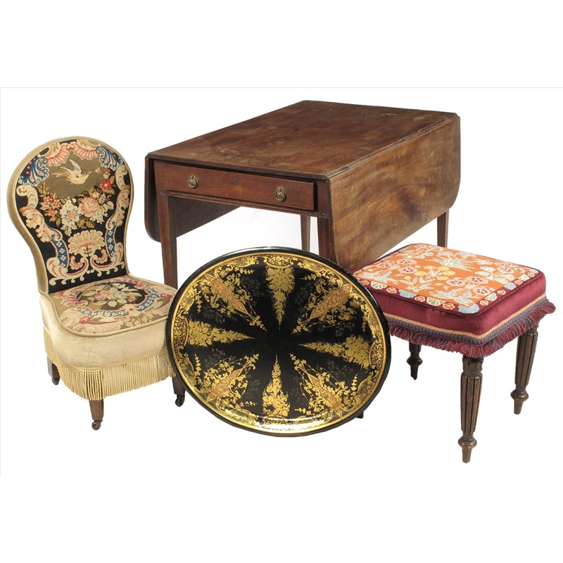 A 19th century mahogany Pembroke table, 27¾in (70.5cm) high, 24¾in (63cm) wide, 37in (94cm) deep, a late Victorian nursing chair with oak and mahogany legs, an oak stool on carved and turned legs and a 19th century oval papier mache tray, 25in (63.5cm) wide. (4)