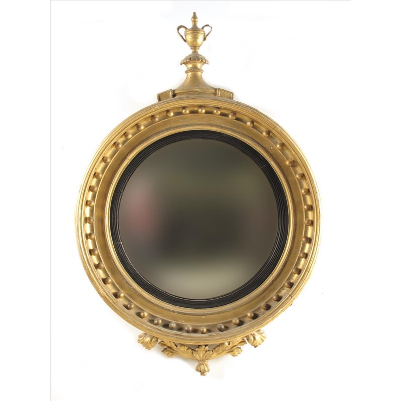 A large early 19th century giltwood and gesso convex mirror, with a replaced urn surmount, 31in (78.6cm) diameter
