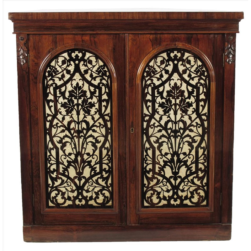 ‡A Victorian rosewood demi-lune side cabinet, with a pair of arch moulded glazed doors with inset coromandel fret cut panels on a silk backing, enclosing a shelf, 35¾in (90.8cm) high, 34¾in (88cm) wide, 17in (43.3cm) deep.
