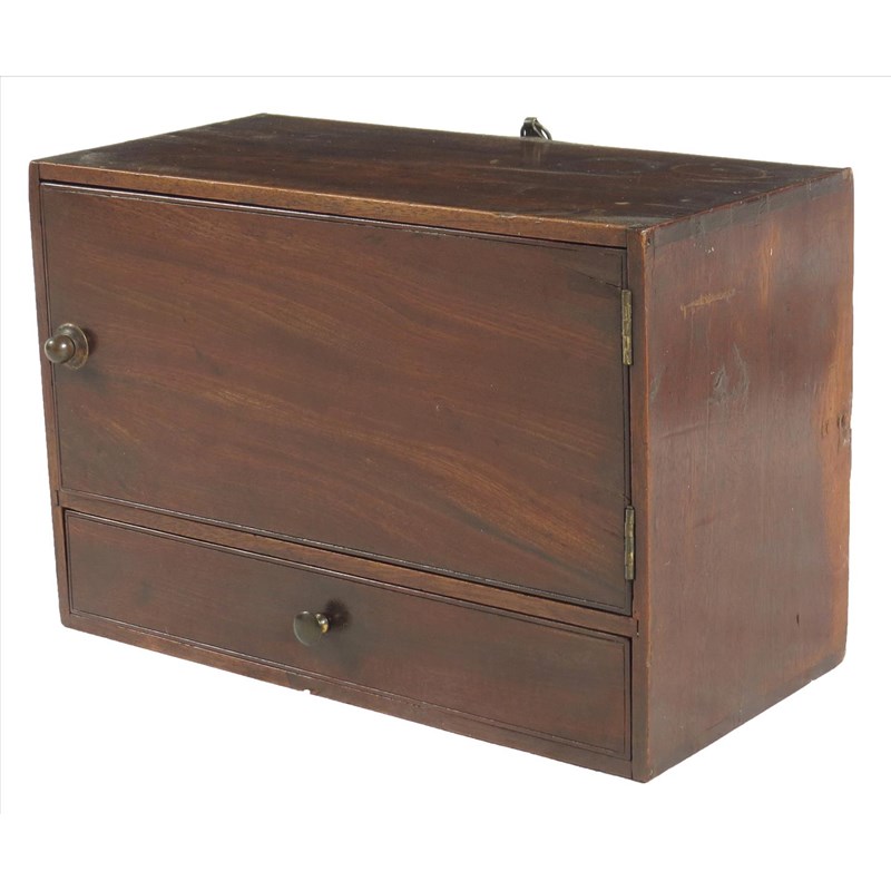 A George IV mahogany wall cabinet, with a hinged door above a drawer, 10¾in (27.4cm) high, 16¼in (41cm) wide, 8in (20.2cm) deep.