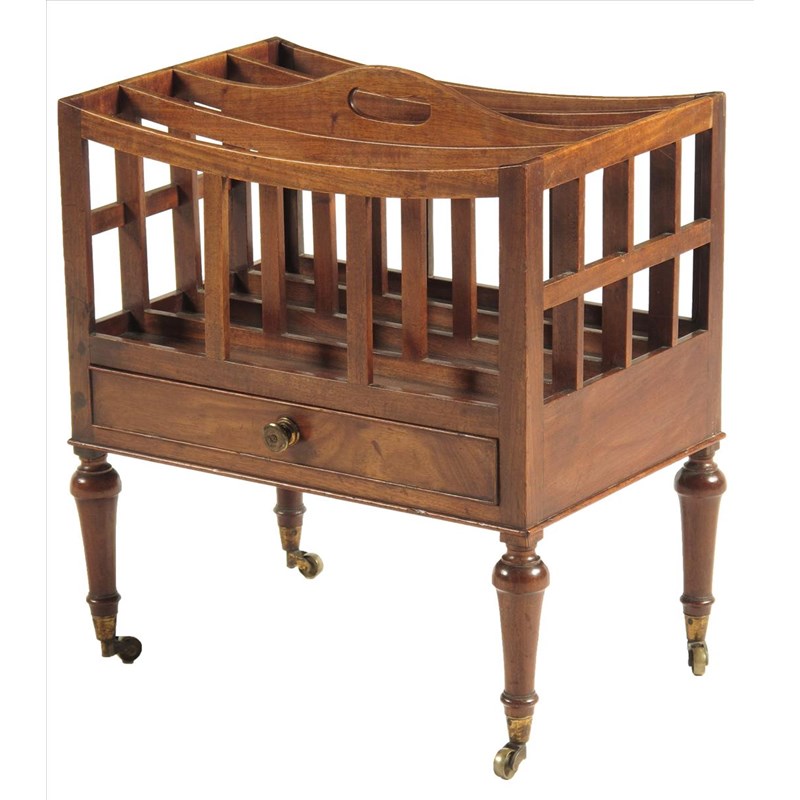 An early 19th century mahogany Canterbury, pierced handgrip with four dip divisions, on turned legs to brass castors, 20in (50.5cm) high, 18½in (46.7cm) wide, 13in (33cm) deep.