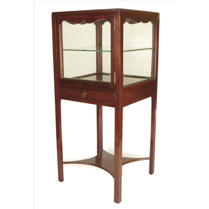 A mahogany vitrine, with inset glass panels, the top within a serpentine frame, above a frieze drawer, 31¾in (80.5cm) high, 13¾in (35cm) square.