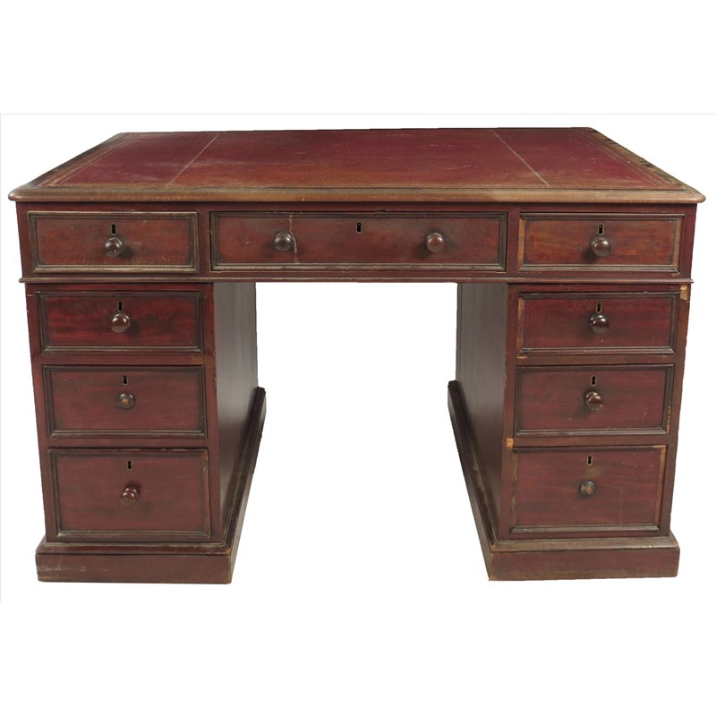 A Victorian mahogany partners desk, with a replaced gilt tooled red leather inset top, the reverse with frieze drawers above cupboard doors enclosing shelves, 29½in (75cm) high, 48in (122cm) wide, 36in (91.5cm) deep.