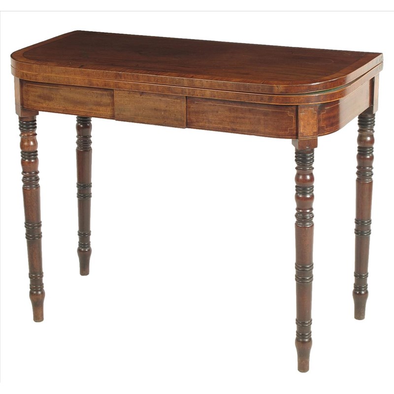 An early 19th century 'D' shape card table, inlaid stringing, the crossbanded top on twin gate supports, 29½in (75cm) high, 36in (91.6cm) wide, 17¾in (44.7cm) deep.