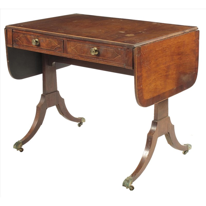 A late George III mahogany sofa table, inlaid stringing, the crossbanded top above twin frieze drawers with false fronts to the reverse, on later brass sabots, 28¾in (72.5cm) high, 34½in (87.5cm) wide, 23½in (59.4cm) deep.