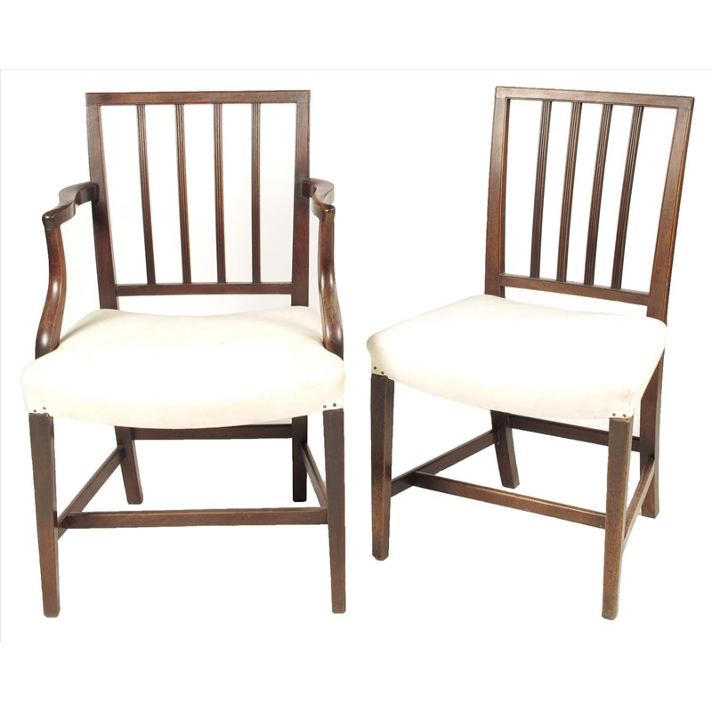 A set of seven late George III mahogany dining chairs, in Sheraton style, each with a reeded rail back to stuffed-over seat, comprising: an open armchair and six side chairs. (7)