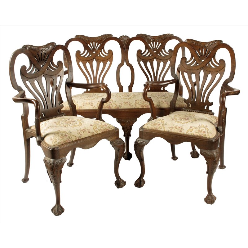 A carved oak double chair back settee in George II style by H. M. Owen, together with a pair of matching open armchairs, each frame signed. (3)
