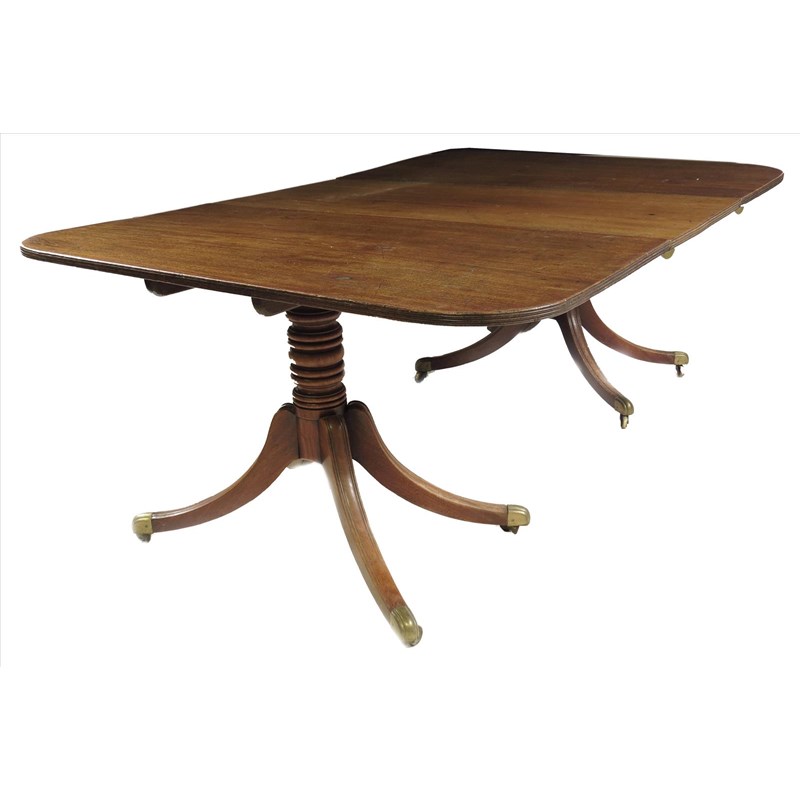 A George IV mahogany dining table, with a reeded edge on turned twin pedestals to splay legs and brass caps and castors, comprising: a pair of 'D' ends and a single leaf, 27½in (69.5cm) high, 73¼in (185.8cm) wide, 50in (126.5cm) deep.