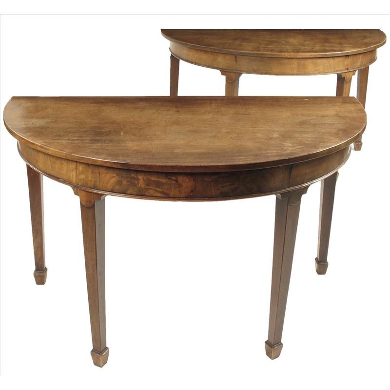 A pair of late George III mahogany 'D' end tables, 28in (71cm) high, 48in (122cm) wide, 25in (63.5cm) deep. (2)