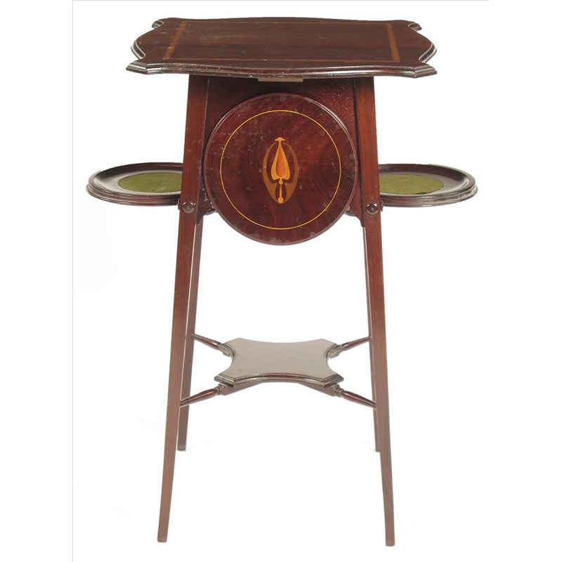 A late Victorian mahogany and marquetry square serpentine top table, with four pivoted baize lined trays, the underside with printed card labels 'Rd AT THE PATENT OFFICE DESIGNS BRANCH,' and 'RD NO. 536802.' 29¼n (74cm) high, 17in (43cm) wide.
