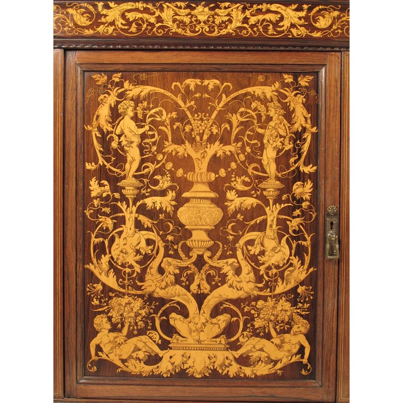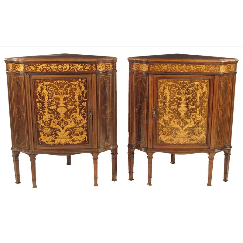 ‡A pair of late Victorian rosewood and marquetry corner cabinets in the manner of Collinson & Lock, each with a breakfront to an inlaid frieze and cupboard door with scrolling foliage and Bacchanalian figures, 35in (88.6cm) high, 29½in (74.8cm) wide, 18¾in (47.5cm) deep.