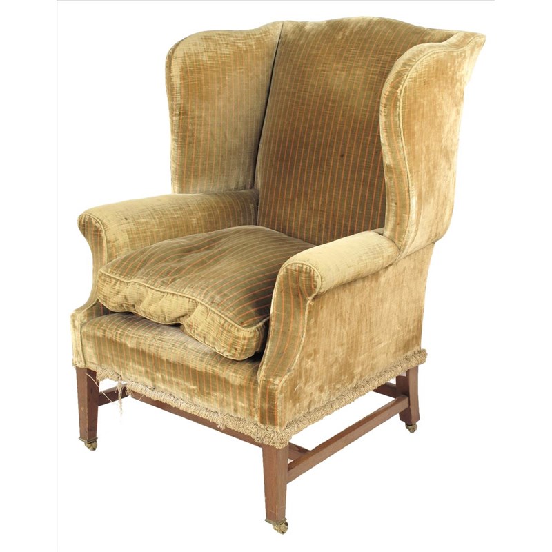 Howard & Sons. A wing armchair, on mahogany legs, the back right stamped '3513 HOWARD & SONS LTD LONDON W1' on brass castors, the underside hessian with applied fabric trade label.