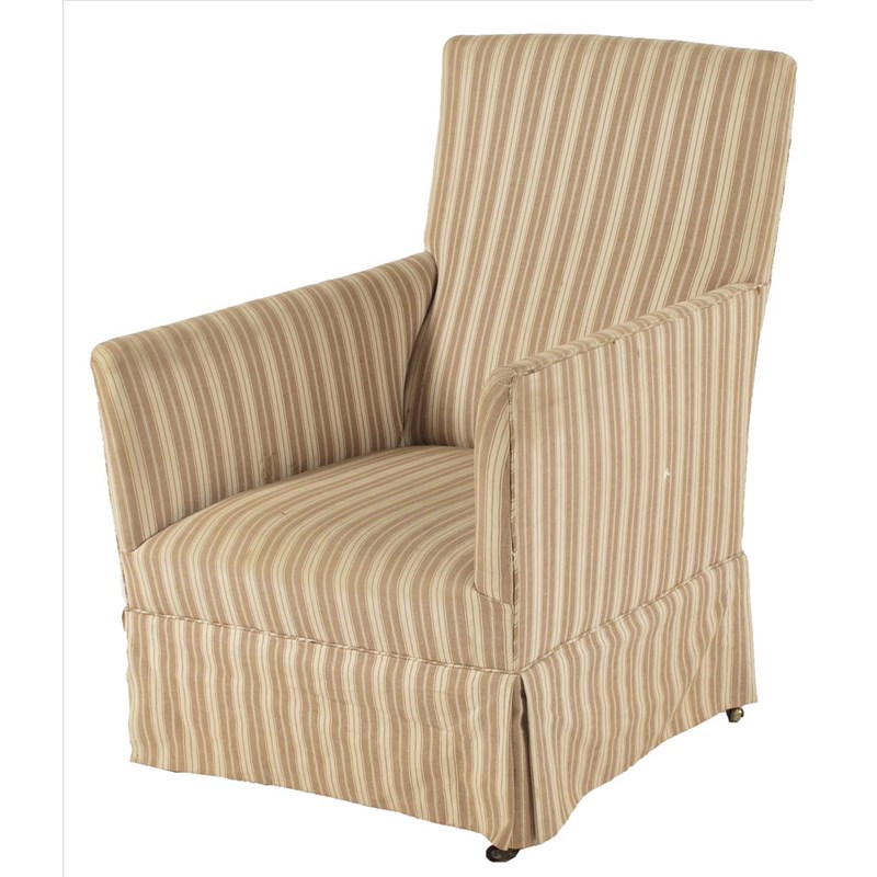 An Edwardian easy armchair, on mahogany tapering legs on brass castors, one missing.