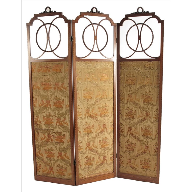An Edwardian mahogany and inlaid three fold screen, with laurel wreath surmounts above glass and fabric panels, 74¾in (189.9cm) high, 19¾in (50cm) wide, each panel.