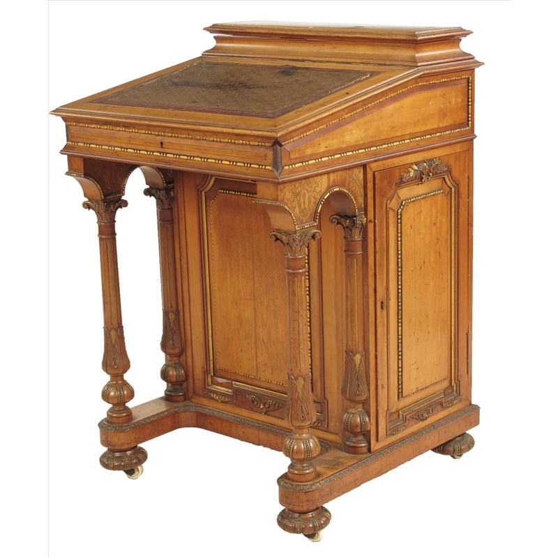 A Victorian satin birch and parcel gilt Davenport, the hinged top revealing divisions, a pen tray and inkwell compartments, to a leather lined fall revealing a vacant interior, the right side with a panel door enclosing four drawers with sunken brass handles, the door and fall with Chubb patent brass locks, the front with carved Corinthian capital columns, on lobed bun feet to ceramic castors, 31¾in (80.5cm) high, 20¾in (52.6cm) wide, 21½in (54.5cm) deep.