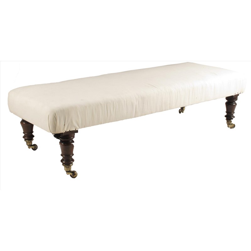 A Victorian long stool, with turned mahogany legs and lapet brass sabots and castors, 16½in (42cm) high, 61in (155cm) wide, 23in (58.5cm) deep.