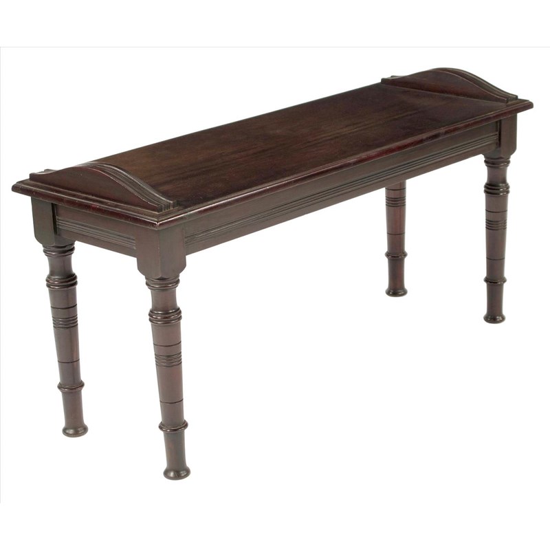 A late Victorian mahogany hall bench, with arched ends to a fluted frieze on turned supports, 22in (56cm) h, 36in (91.3cm) w, 13in (33cm) d.
